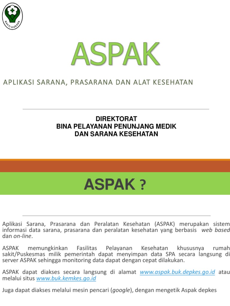 Aspak Direktorat Fasilitas Pelayanan Kesehatan Direktorat Jenderal Pelayanan Kesehatan Kementerian Kesehatan Ri Aplikasi Sarana Prasarana Dan Peralatan Ppt Download