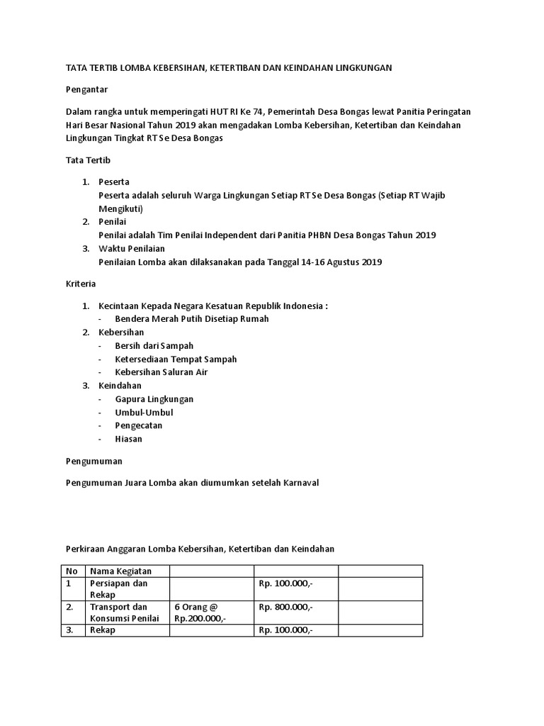 Contoh format penilaian lomba kebersihan lingkungan rt. Lomba yang merupakan ajang unjuk gigi untuk masalah kebersihan kesehatan dan penghijauan wilayah RW se kota Malang ini merupakan penilaian evaluasi dari lomba sebelumnya yaitu Lomba Bersih dan Hijau. SMK NEGERI 1 KALIGONDANG.